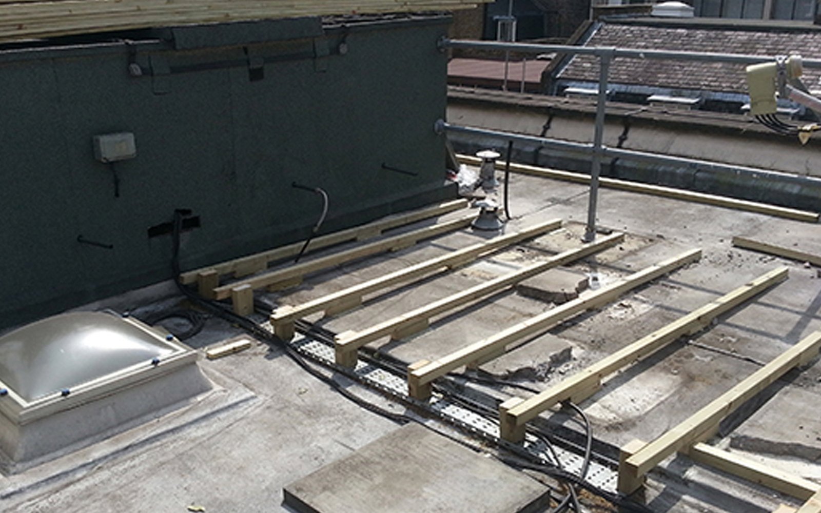 This roof decking project highlights the transformation of an urban rooftop into a functional and stylish outdoor space. High-quality timber decking was installed to create a durable and visually appealing surface, complemented by a bespoke timber structure for added interest and practicality. The clean lines and warm tones of the wood enhance the overall aesthetic, while the craftsmanship ensures long-lasting performance in an exposed environment. This project demonstrates the effective use of rooftop space, providing a refined and inviting area for relaxation or entertaining in the heart of the city.